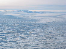 Ice from the East Antarctic ice sheet flows through the Transantarctic Mountains via a series of outlet glaciers into the Ross Sea, Ross Ice Shelf, and West Antarctic Ice Sheet. These glaciers generally flow perpendicular to the orientation of the range and define subranges and peak groups. It has been thought that many of these outlet glaciers follow the traces of large-scale geologic faults. However the ice flow theories will be reevaluated in light of new data from recent ice-penetrating radar surveys which revealed the presence of three previously unknown deep subglacial valleys affecting the "mountainous subglacial topography beneath the ice divide".[4] These geographic features are likely to have a significant impact on models and calculations related to ice flow through the Transantarctic Mountain region.[5]