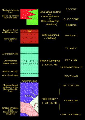 The mountains consist of sedimentary layers lying upon a basement of granites and gneisses. The sedimentary layers include the Beacon Supergroup sandstones, siltstones, and coal deposited beginning in the Silurian period and continuing into the Jurassic. In many places the Beacon Supergroup has been intruded by dikes and sills of Jurassic age Ferrar Dolerite. Many of the fossils found in Antarctica are from locations within these sedimentary formations.