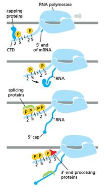 As shown in the image in the right it is evident that the CTD (C Terminal Domain) is a tail that changes its shape; this tail will be used as a carrier of splicing, capping and polyadenylation, as shown in the image on the left.[17]