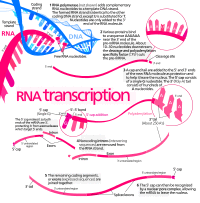 The stretch of DNA transcribed into an RNA molecule is called a transcription unit and encodes at least one gene. If the gene encodes a protein, the transcription produces messenger RNA (mRNA); the mRNA, in turn, serves as a template for the protein's synthesis through translation. Alternatively, the transcribed gene may encode for non-coding RNA such as microRNA, ribosomal RNA (rRNA), transfer RNA (tRNA), or enzymatic RNA molecules called ribozymes.[1] Overall, RNA helps synthesize, regulate, and process proteins; it therefore plays a fundamental role in performing functions within a cell.