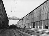 Steam locomotive on the transfer table between buildings in Santa Fe's San Bernardino, California shops in March 1943