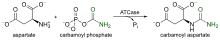 EC 2.1 includes enzymes that transfer single-carbon groups. This category consists of transfers of methyl, hydroxymethyl, formyl, carboxy, carbamoyl, and amido groups.[31] Carbamoyltransferases, as an example, transfer a carbamoyl group from one molecule to another.[32] Carbamoyl groups follow the formula NH2CO.[33] In ATCase such a transfer is written as carbamoyl phosphate + L-aspartate L-carbamoyl aspartate + phosphate.[34]