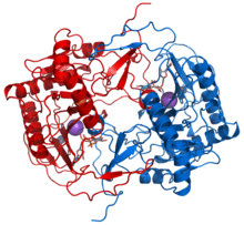 EC 2.4 includes enzymes that transfer glycosyl groups, as well as those that transfer hexose and pentose. Glycosyltransferase is a subcategory of EC 2.4 transferases that is involved in biosynthesis of disaccharides and polysaccharides through transfer of monosaccharides to other molecules.[40] An example of a prominent glycosyltransferase is lactose synthase which is a dimer possessing two protein subunits. Its primary action is to produce lactose from glucose and UDP-galactose.[41] This occurs via the following pathway: UDP-β-D-galactose + D-glucose UDP + lactose.[42]