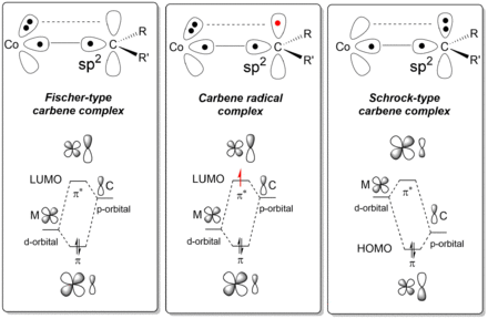 - π-acceptor substituents on the ligand such as carbonyl or sulfonyl groups. The chemical bond present in carbene radicals is described as aspects of both Fischer and Schrock carbenes.