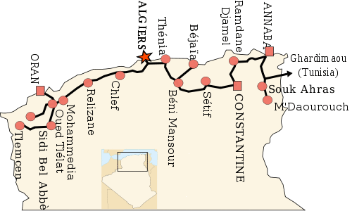 Currently the cities of Algiers, Oran, Constantine, Setif, Sidi bel Abbes and Ouargla have a tram line in operation. Tram projects have been launched in the east in Mostaganem since 2015.[6] The government, wanting to diversify the country's future in rail transport, has assigned the Algiers Subway Company to the projects.