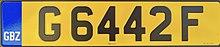 Gibraltar's international vehicle registration is GBZ, and vehicle registration plates of Gibraltar consist of the letter 'G' followed by up to five digits (1-99999) or four digits (1000-9999) and a single letter. These are as standard, the same shape, type face and colours as those in the UK, however non-standard number plates have been permitted. The Chief Minister's official car has the registration number G1, while the Governor's car, following tradition, has a crown, in place of a number.