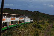 St. Kitts has 58 km of 2 ft 6 in (762 mm) narrow gauge railway, which centers in the capital, Basseterre, and circles the island. The railway line was originally built between 1912 and 1926 to transport sugar cane to the central sugar factory in Basseterre. The last load of sugar cane was delivered to the now-defunct factory in 2005, but since 2003 the railway has offered a circle tour of the island aboard specially designed open-air, double-decker coaches primarily for tourists.[2] The St. Kitts Scenic Railway train currently runs from Sandy Point to Basseterre, traveling east.
