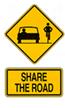 The third sign is the most rare of all, with a car on the left side, a cyclist on the right, and a sign saying "Share the road". This sign is located on busy road where it is narrow enough that motorists and cyclists have to share a lane.