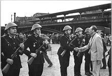 The Transportpolizei (German for "Transport Police") was the transit police of the German Democratic Republic (East Germany), whose officers were commonly nicknamed TraPos. It was part of the Volkspolizei and dealt with all modes of transit but primarily with trains and railroads. It consisted of approximately 8,500 men, that were organized from a national level and at district level with each Deutsche Reichsbahn district; Berlin, Cottbus, Dresden, Erfurt, Greifswald, Halle, Magdeburg and Schwerin. They wore dark-blue uniforms (that were colloquially called “blueberries”) instead of the standard green Volkspolizei uniform. They were organized into sixteen companies and equipped with small arms and RPG-7 shoulder-fired antitank grenade launchers. The Transportpolizei supervised all larger train stations and controlled the travellers, particularly at the border with West Germany, and directed traffic. Before the building of the Berlin Wall, the Transportpolizei controlled the S-Bahn in West Berlin (as the Deutsche Reichsbahn controlled the S-Bahn in both East and West Berlin). In the 'interzone courses' (later called 'transit courses') there was always an escort party of the Transportpolizei present. The service training school of the Transportpolizei was in Halle.