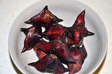 In India and Pakistan, it is known as singhara or paniphal (eastern India) and is widely cultivated in freshwater lakes. The fruits are eaten raw or boiled. When the fruit has been dried, it is ground to a flour called singhare ka atta, used in many religious rituals, and can be consumed as a phalahar (fruit diet) on the Hindu fasting days, the navratas.[5]
