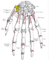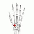 Left hand anterior view (palmar view). Trapezium shown in red. | |
