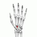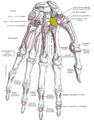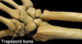 | Articulations | articulates with four bones: scaphoid proximally second metacarpal distally trapezium bone laterally capitate medially |