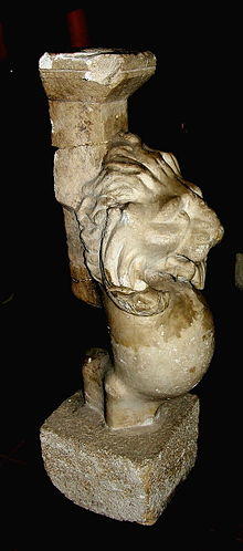 A trapezophore, trapezophorum or trapezophoron is the leg or pedestal of a small side table, generally in marble, and carved with winged lions or griffins set back to back, each with a single leg, which formed the support of the pedestal on either side. In Pompeii there was a fine example in the house of Cornelius Rufus, which stood behind the impluvium. These side tables were known as mensae vasariae and were used for the display of vases, lamps, and such. Sometimes they were supported on four legs, the example at Pompeii (of which the museums at Naples and Rome contain many varieties) had two supports only, one at each end of the table. The term is also applied to a single leg with lion's head, breast and forepaws, which formed the front support of a throne or chair.[1]