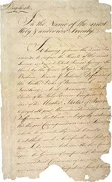 This treaty and the separate peace treaties between Great Britain and the nations that supported the American cause—France, Spain, and the Dutch Republic—are known collectively as the Peace of Paris.[3][4] Only Article 1 of the treaty, which acknowledges the United States' existence as free sovereign and independent states, remains in force.[5] The borders of the USA changed in later years, which is a major reason for specific articles of the treaty to be superseded.