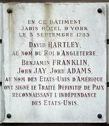 Peace negotiations began in Paris in April 1782 and continued through the summer. Representing the United States were Benjamin Franklin, John Jay, Henry Laurens, and John Adams. David Hartley and Richard Oswald represented Great Britain. The treaty was drafted on November 30, 1782,[a] and signed at the Hôtel d'York (at present 56 Rue Jacob) in Paris on September 3, 1783, by Adams, Franklin, Jay, and Hartley.[6]