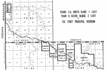 The New Purchase was a jagged shaped area comprising most of the central third of the state. It had a large trapezoid "bite" out of the northern boundary that became the Great Miami Reserve, and a sawtooth in the northwest where the Tippecanoe and Wabash Rivers formed a gore. The treaties defined the northern and western boundary as the Wabash, Tippecanoe, and Vermillion rivers; the southwestern and southeastern boundaries were the treaty lines from the Treaty of Fort Wayne of 1809; the far southeastern and northeastern boundaries were treaty lines from the Treaty of Grouseland of 1805, and parts of the eastern and western boundaries were the borders of the state. The southern tip of the area extended to what is today central Jackson County near Brownstown.