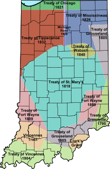 The main treaty was with the Miamis, who were the main tribe in Indiana. Unqualified references to the treaty usually refer to this one. The treaties acquired a substantial portion of the land area (dubbed the New Purchase) of the state of Indiana from the Miami, Delaware, Potawatomi, and others in exchange for cash, salt, sawmills, and other goods, effectively moving the northern boundary of the state from near the Ohio River to the Wabash River in the northwest and north. They also resulted in creation of Indian reservations and continued the process of Indian removals in Indiana begun by the Treaty of Greenville in 1795.