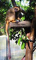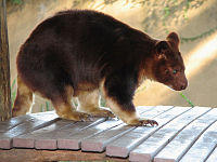 The main diet of the tree-kangaroo is leaves and fruit that it gathers from the trees, but occasionally scavenged from the ground. Tree-kangaroos will also eat grains, flour, various nuts, sap and tree bark.[17] Some captive tree-kangaroos (perhaps limited to New Guinea species) eat protein foods such as eggs, birds and snakes, making them omnivores.[2]