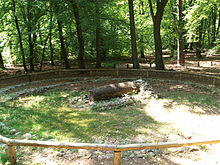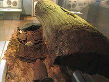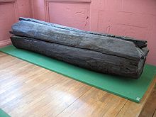 A treetrunk coffin, hollowed out of a single massive log, is a feature of some prehistoric elite burials over a wide geographical range, especially in Northern Europe and as far east as the Balts, where cremation was abandoned about the 1st century CE, as well as in central Lithuania, where elites were also buried in treetrunk coffins.[1] The practice survived Christianization into the Middle Ages. The coffin in which the body of King Arthur, said to have been discovered at Glastonbury Abbey in 1191, was described by the contemporary chronicler Giraldus Cambrensis as being of a massive oak treetrunk. For Bronze Age Britain, examples have been recorded at Wydon Eals, near Haltwhistle, and at Cartington, Co. Durham,[2] in Scotland, Yorkshire, East Anglia (Liss, northeast Hampshire, for instance). In Yorkshire, "Gristhorpe Man",[3] a well-preserved human of the second millennium BCE, who was found 10 July 1834 under an ancient burial mound buried in a hollow oak tree trunk, is conserved at the Rotunda Museum, Scarborough: he was wrapped in an animal skin with a whalebone and bronze dagger and food for his journey. At the abbey of Munsterbilzen, Belgium, ten graves with massive treetrunk coffins were discovered in 2006.