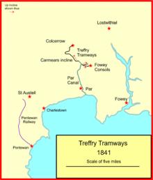 The line was built on land owned by Treffry or by agreement with the owner and the commissioners of the turnpike trust, and no authorising Act of Parliament was sought. Although by this time locomotive traction had proved itself as effective in railway use, Treffry settled for horse operation as it would be three-quarters of the cost of locomotives. Treffry also used water wheels in preference to stationary steam engines where water was available, in view of the low operating cost. Coal was not naturally available in Cornwall and was expensive.[7] Minerals brought down to Pontsmill were transshipped to barges on Treffry's canal for onward conveyance to Par Harbour and coastal shipping.[5][8][1]