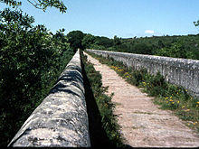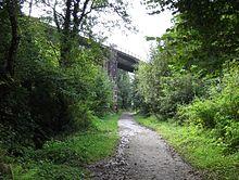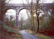 The short section to Colcerrow was only a start, and the tramway was continued to Molinnis,[note 3] near Bugle. While the gradients were easier here, it was necessary to cross to the west side of the valley, and a large viaduct was built to carry the line. Known as the Treffry Viaduct, it was 648 feet in length with ten arches, and was 98 feet high. It was the first large granite viaduct in Cornwall: the foundation stone was laid in March 1839 and weighed 10 tons.[9] As well as carrying the tramway it contained a leat conveying water down to the Carmears waterwheel.[2]