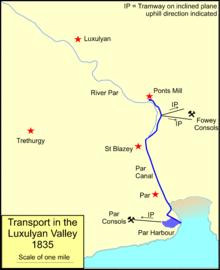 Treffry turned his thoughts to developing a harbour at Par, and he had one built there to the west of the mouth of the Par River; it was in operation from 1833. He built the Par Canal, connecting Pontsmill with the harbour. It was operational in 1840.[1] He had a mine at Lanescot to the east of Pontsmill; it proved to be founded on a rich source of copper and developed into the Fowey Consols mine, and Treffry built a narrow gauge tramway on an inclined plane to bring the mineral from the shaft heads to Pontsmill.