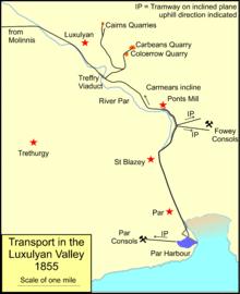 - ^ According to Vaughan: he says, "Although many railway history books show the ... opening on 18th May 1847, all the evidence shows it was opened early in 1844, according to the Pease diaries and the West Briton [newspaper]. Certainly the incline, viaduct and tramway were open by then." Baxter quotes 1847; MacDermot does not give a date for the tramway, but states that the viaduct was finished in 1842. The exhaustive Cornwall County Council archaeological survey says (page 44) the viaduct "was built during the period 1839 to 1842"; but on page 45, referring to the mineral activities in general, states "By 1845 this extraordinary industrial complex was fully operational."