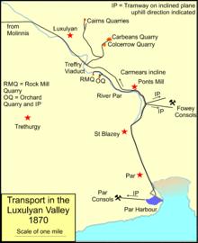 Copper production was very demanding of transport: of coal inwards to fuel the engines, and of the ore outwards to the refining plant. In both cases this traffic was from and to South Wales, and the coastal shipping route was round Land's End, a difficult and dangerous passage. In 1835 Treffry let it be known that he intended to connect Par and Newquay by tramway or railway. There was a small harbour at Newquay, and its location on the north coast favoured communication with South Wales.[4][5][6]
