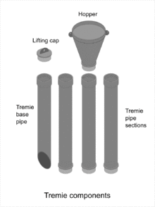 A tremie is a watertight pipe, usually of about 250mm inside diameter (150 to 300 mm),[1] with a conical hopper at its upper end above the water level. It may have a loose plug or a valve at the bottom end. A tremie is used to pour concrete underwater in a way that avoids washout of cement from the mix due to turbulent water contact with the concrete while it is flowing. This produces a more reliable strength of the product. Common applications include the following.