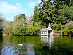 - The lake and Victorian boathouse, which is now a listed building. Water runs down from the lake through a 1 mile (1.6 km) series of cascades to Trevarno Watermill.[2]