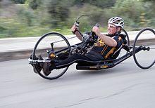 With hand and foot trikes, the rider makes a pair of front wheels change directions by shifting the center of weight and moves forward by rotating the rear wheel. The hand and foot trike can be also converted into a manual tricycle designed to be driven with both hands and both feet.[21][22] There are also new hybrids between a handcycle, a recumbent bike and a tricycle, these bikes make it even possible to cycle with legs despite a spinal cord injury.[23]