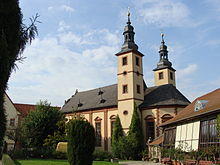 - Kloster Triefenstein - founded in 1102 by Gerung, dean of Kollegiatstift Neumunster in Würzburg. The monastery was named after a nearby spring (Triefender Stein). In 1160, the church and monastery burned down. A new, Romanesque, church was consecrated in 1164. From 1617 to 1620 significant alterations were made to this church. Then from 1687 to 1715 church and monastery were completely rebuilt, likely by Würzburg architect Valentin Pezani (d. 1719). The current church (Klosterkirche St. Peter und Paul) has one nave with a choir flanked by two slender towers (dating to 1687). The interior decoration dates to 1783 to 1803 and is considered a high point of Franconian Neoclassicism.[19]:113 The Löwenstein family sold the monastery in 1986 to the Protestant Christusträger-Bruderschaft.[3]:107The Kloster is not generally open to the public, but access is possible at certain times.[14][28]