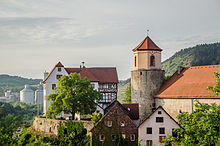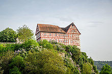 - Schloss Homburg (castle) - The lower floors of the Romanesque donjon date to the 12th to 13th centuries, whilst the octagonal top was only added in the 18th century. The three-wing half-timbered building (circa 1568) of the von Gebsattel family, who served as Amtsmänner for Würzburg is the only remaining palas in the castle.[19]:96 In 1602, Bishop Julius Echter bought the castle. With the removal of official functions from Homburg, the castle fell into disuse in the 1830s. Since 1869 the castle has been owned by the town. It served as a school, as a rectory and as the seat of the municipal administration. However, in the 1970s these uses ceased - after 1978 the newly created Markt Triefenstein was administered from Lengfurt.[7]