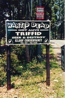 The triffid is a fictional tall, mobile, carnivorous plant species, created by John Wyndham in his 1951 novel The Day of the Triffids, which has since been adapted for film and television. The word "triffid" has become a common reference in British English to describe large, invasive or menacing-looking plants.[1]