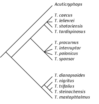 Acuticryphops is probably ancestral to Trimerocephalus, and mainly differs from its descendants in having an eye lobe with a small number of lenses. Crônier, 2003, erected the subgenus Trimerocephalus (Trifoliops) containing T. trifolius and T. nigritus.[1] In order not to be polyphyletic, T. (Trifoliops) would need to include at least T. steinachensis, and preferably T. dianopsoides as well. These species are in the same clade as T. mastophtalmus however, which is the type of the genus Trimerocephalus, which would by definition be in the nominal subgenus Trimerocephalus (Trimerocephalus). This in turn would prompt the erection of another subgenus with all remaining species shown in the cladogram.