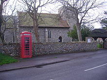 The church has a short tower which is thought to be unfinished. It has heavy buttresses on the west elevation which suggest that a fault in the construction of the church may well have been the reasoning for the unfinished tower. The nave to the east cuts around the buttress to embrace it. This peculiarity may be partly the result of a restoration by Thomas Jekyll in the 1850s. Pevsner states in his survey book, that Thomas Jekyll completely rebuilt the nave of which the most notable feature is the way that the tower buttresses on the east side project into the nave.[3] The church's rood screen has four figures on either side of the entrance to the chancel: St Edmund with his arrow, St Clare with her book and monstrance, St Clement with his anchor and crozier, and St James in his pilgrim's robes. On the south side are St Petronella with her book and keys, St Cecilia with her garland of flowers, St Barbara with her tower, and St Jeron with his hawk. The east window of the church is credited to H Wilkinson and dates from 1925.[4] the window depicts 'Christ in Majesty' flanked by St Michael and St Gabriel, with the symbols of the four Evangelists surrounding them.
