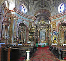 The design is thought to be copied from the St. Peter's Church in Vienna. The arch is dominated by a cupola with trompe-l'œil fresco from Italian Baroque painter Antonio Galli Bibiena. The massive main altar of the church was presumably built by A. G. Bussi. Its main work of art is an altarpiece depicting St. John of Matha and St. Felix of Valois ransoming prisoners from Turkish capture.[3] Statues of St. Agnes and St. Catherine situated at the rear of the main altar are attributed to the Bavarian sculptor Johann Baptist Straub. The rear altar of the Virgin Mary was built in 1736 on the order of the Count Zichy. This altar has a copy of the Regensburg painting of the Madonna. The main portal is richly decorated in Rococo style, celebrating the Holy Trinity.[4]