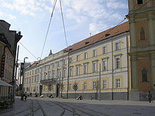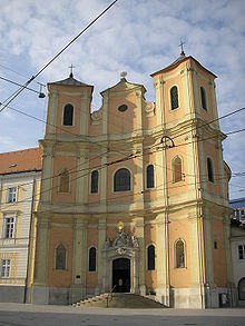 The church was built on the site of the older Church of St. Michael, which was demolished in 1529, along with the settlement of St. Michael, during the Ottoman wars, along with other suburbs, so as to see better the attacking Turks.[1] The Trinitarian Order started construction of the church in 1717 and it was sanctified in 1727, although work in the interior continued into the first half of the 18th century.[2]