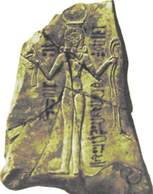 The religious scholar Saul M. Olyan, the author of Asherah and the Cult of Yahweh in Israel, calls the representation on the Qudshu-Astarte-Anat plaque "a triple-fusion hypostasis" and considers Qudshu to be an epithet of Athirat by a process of elimination since Astarte and Anat appear after Qudshu in the inscription.[9][10]
