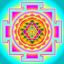 In the Shri Vidya school of Hindu tantra, the Sri Yantra ("sacred instrument"), also Sri Chakra is a diagram formed by nine interlocking triangles that surround and radiate out from the central (bindu) point. It represents the goddess in her form of Shri Lalita Or Tripura Sundari, "the beauty of the three worlds (earth, atmosphere and sky(heaven)"(Bhoo, Bhuva and Swa). The worship of the Sri Chakra is central to the Shri Vidya system of Hindu worship. Four isosceles triangles with the apices upwards, representing Shiva or the Masculine. Five isosceles triangles with the apices downward, symbolizing female embodiment Shakti. Thus the Sri Yantra also represents the union of Masculine and Feminine Divine. Because it is composed of nine triangles, it is known as the Navayoni Chakra.[22] "These nine triangles are of various sizes and intersect with one another. In the middle is the power point (bindu), visualizing the highest, the invisible, elusive centre from which the entire figure and the cosmos expand. The triangles are enclosed by two rows of (8 and 16) petals, representing the lotus of creation and reproductive vital force. The broken lines of the outer frame denote the figure to be a sanctuary with four openings to the regions of the universe".[23]