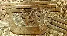 Ships with a horsehead decoration, perhaps cult ships, are also represented in artifacts of the Minoan/Mycenaean era;[21][22] the image[23] on a seal found in the palace of Knossos, dated around 1200 BC, which depicts a ship with oarsmen and a superimposed horse figure, originally interpreted as a representation of horse transport by sea,[24] may in fact be related to this kind of vessels, and even be considered as the first (pre-literary) representation of the Trojan Horse episode.[25]