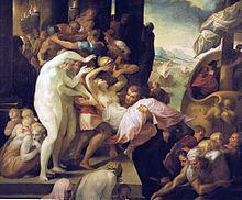 Eight years after the storm had scattered them,[63] the fleet of more than a thousand ships was gathered again. But when they had all reached Aulis, the winds ceased. The prophet Calchas stated that the goddess Artemis was punishing Agamemnon for killing either a sacred deer or a deer in a sacred grove, and boasting that he was a better hunter than she.[39] The only way to appease Artemis, he said, was to sacrifice Iphigenia, who was either the daughter of Agamemnon and Clytemnestra,[64] or of Helen and Theseus entrusted to Clytemnestra when Helen married Menelaus.[65] Agamemnon refused, and the other commanders threatened to make Palamedes commander of the expedition.[66] According to some versions, Agamemnon relented and performed the sacrifice, but others claim that he sacrificed a deer in her place, or that at the last moment, Artemis took pity on the girl, and took her to be a maiden in one of her temples, substituting a lamb.[39] Hesiod says that Iphigenia became the goddess Hecate.[67]