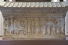 Achilles, maddened with grief over the death of Patroclus, swore to kill Hector in revenge. The exact nature of Achilles' relationship to Patroclus is the subject of some debate.[107] Although certainly very close, Achilles and Patroclus are never explicitly cast as lovers by Homer,[108] but they were depicted as such in the archaic and classical periods of Greek literature, particularly in the works of Aeschylus, Aeschines and Plato.[109][110] He was reconciled with Agamemnon and received Briseis back, untouched by Agamemnon. He received a new set of arms, forged by the god Hephaestus, and returned to the battlefield. He slaughtered many Trojans, and nearly killed Aeneas, who was saved by Poseidon. Achilles fought with the river god Scamander, and a battle of the gods followed. The Trojan army returned to the city, except for Hector, who remained outside the walls because he was tricked by Athena. Achilles killed Hector, and afterwards he dragged Hector's body from his chariot and refused to return the body to the Trojans for burial. The body nevertheless remained unscathed as it was preserved from all injury by Apollo and Aphrodite. The Achaeans then conducted funeral games for Patroclus. Afterwards, Priam came to Achilles' tent, guided by Hermes, and asked Achilles to return Hector's body. The armies made a temporary truce to allow the burial of the dead. The Iliad ends with the funeral of Hector.