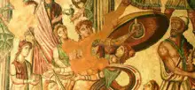 At Skyros, Achilles had an affair with the king's daughter Deidamia, resulting in a child, Neoptolemus.[50] Odysseus, Telamonian Ajax, and Achilles' tutor Phoenix went to retrieve Achilles. Achilles' mother disguised him as a woman so that he would not have to go to war, but, according to one story, they blew a horn, and Achilles revealed himself by seizing a spear to fight intruders, rather than fleeing.[26] According to another story, they disguised themselves as merchants bearing trinkets and weaponry, and Achilles was marked out from the other women for admiring weaponry instead of clothes and jewelry.[51]
