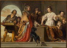 Finally, one of the suitors, Odysseus of Ithaca, proposed a plan to solve the dilemma. In exchange for Tyndareus' support of his own suit towards Penelope,[34] he suggested that Tyndareus require all of Helen's suitors to promise that they would defend the marriage of Helen, regardless of whom he chose. The suitors duly swore the required oath on the severed pieces of a horse, although not without a certain amount of grumbling.[35]