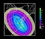The main storm surge forecast model in the Atlantic basin is SLOSH, which stands for Sea, Lake, Overland, Surge from Hurricanes.[25] It uses the size of a storm, its intensity, its forward motion, and the topography of the coastal plain to estimate the depth of a storm surge at any individual grid point across the United States. An accurate forecast track is required in order to produce accurate storm surge forecasts. However, if the landfall point is uncertain, a maximum envelope of water (MEOW) map can be generated based on the direction of approach. If the forecast track itself is also uncertain, a maximum of maximums (MoM) map can be generated which will show the worst possible scenario for a hurricane of a specific strength.[26]