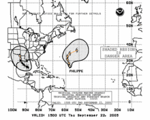 The 1-2-3 rule (mariner's 1-2-3 rule or danger area) is a guideline commonly taught to mariners for severe storm (specifically hurricane and tropical storm) tracking and prediction. It refers to the rounded long-term NHC/TPC forecast errors of 100-200-300 nautical miles at 24-48-72 hours, respectively. These numbers were close to the 10-year average for the 1982–1991-time frame.[9] However, these errors have decreased to near 50-100-150 as NHC forecasters become more accurate. The "danger area" to be avoided is constructed by expanding the forecast path by a radius equal to the respective hundreds of miles plus the forecast wind radii (size of the storm at those hours).[10]