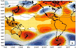 A zonal flow regime is the meteorological term meaning that the general flow pattern is west to east along the Earth's latitude lines, with weak shortwaves embedded in the flow.[8] The use of the word "zone" refers to the flow being along the Earth's latitudinal "zones". This pattern can buckle and thus become a meridional flow.