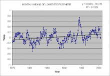 Measuring the temperature change with height through the troposphere and the stratosphere identifies the location of the tropopause. In the troposphere, temperature decreases with altitude. In the stratosphere, however, the temperature remains constant for a while and then increases with altitude. This coldest layer of the atmosphere, where the lapse rate changes from positive (in the troposphere) to negative (in the stratosphere), is defined as the tropopause.[3] Thus, the tropopause is an inversion layer, and there is little mixing between the two layers of the atmosphere.