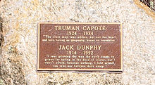 Capote was cremated and his remains were reportedly divided between Carson and his longtime companion, author Jack Dunphy (although Dunphy has maintained that he received all the ashes).[46][47] Carson said she kept the ashes in an urn in the room where he died.[47] Those ashes were reported stolen during a Halloween party in 1988 along with $200,000 in jewels but were then returned six days later being found in a coiled up garden hose on the back steps of Carson's Bel Air home.[46][47] The ashes were reportedly stolen again when brought to a production of Tru but the thief was caught before leaving the theatre. Carson bought a crypt at Westwood Village Memorial Park Cemetery in Los Angeles.[46] However, it is unclear if the ashes were actually deposited in the crypt which bears his name. In 2013 the producers offered to fly Carson and the ashes to New York for a Broadway production of Breakfast at Tiffany's. Carson declined the offer.[47] Dunphy died in 1992, and in 1994 both his and Capote's ashes were reportedly scattered at Crooked Pond, between Bridgehampton, New York, and Sag Harbor, New York on Long Island, close to Sagaponack, New York, where the two had maintained a property with individual houses for many years. Crooked Pond was chosen because money from the estate of Dunphy and Capote was donated to the Nature Conservancy, which in turn used it to buy 20 acres around Crooked Pond in area called "Long Pond Greenbelt." A stone marker indicates the spot where their ashes were thrown in the pond.[48]